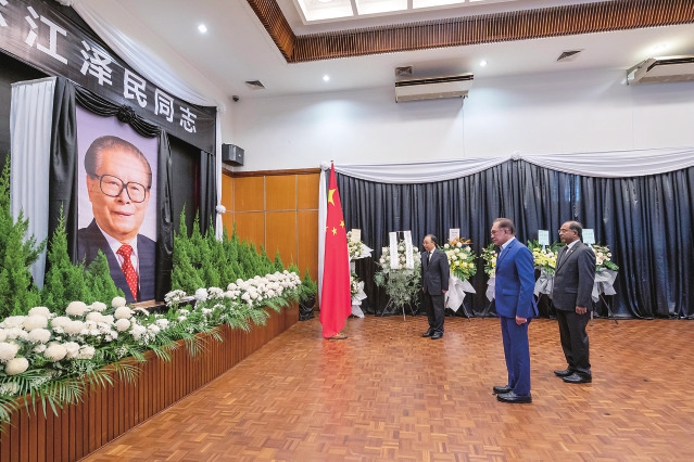 12月6日,马来西亚总理安瓦尔(右二)在中国驻马来西亚大使馆吊唁江泽民同志。 新华社发(张纹综摄)