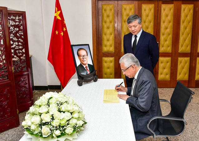 12月2日,毛里求斯总理贾格纳特在中国驻毛里求斯大使馆吊唁江泽民同志。 新华社发(中国驻毛里求斯大使馆供图)