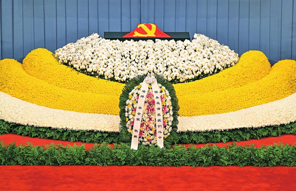 12月6日上午,中共中央、全国人大常委会、国务院、全国政协、中央军委在北京人民大会堂隆重举行江泽民同志追悼大会。 江泽民同志的骨灰盒安放在遗像前的鲜花翠柏丛中,骨灰盒上覆盖着鲜红的中国共产党党旗。江泽民同志的夫人王冶坪率全家敬献的花篮摆放在江泽民同志的骨灰盒前。 新华社记者殷博古摄