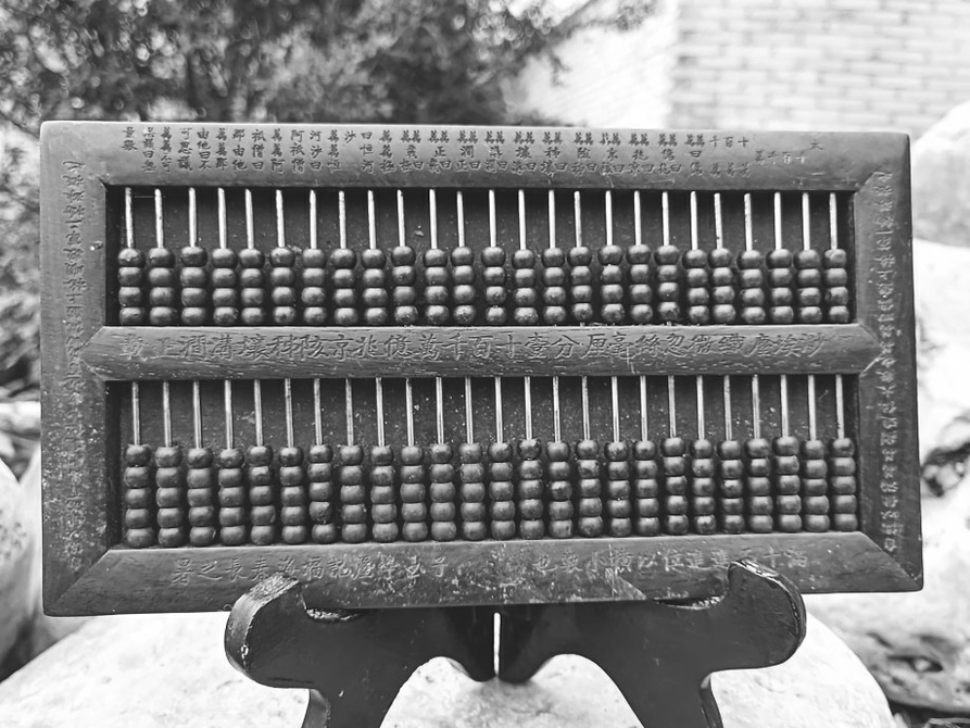 面刻着“子玉算盘,周懋琦(清)制”的字样。算盘虽小,在算盘正面却有着25级计数单位,比一般的算盘要多,且其梁上的珠子不是2个而是4个的,也与一般的箅盘有别,甚为罕见,究竟其用法及用途是怎样的,尚待考究。