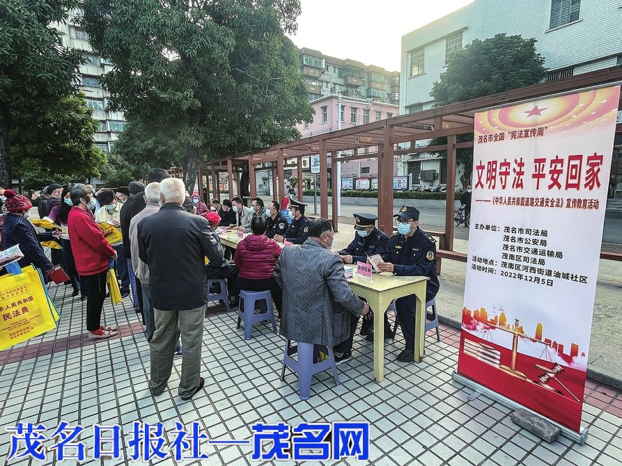 12月4日,共青团茂名市委员会、茂名市司法局、茂名市青少年活动中心联合举办“增强宪法意识,弘扬宪法精神”青少年普法宣传活动。以国家宪法日为契机,市司法局联合市公安局、市交通运输局等部门推动交通安全与“宪法宣传周”普法宣传充分融合,紧扣“文明守法平安回家”主题开展《中华人民共和国道路交通安全法》普法宣传活动。12月9日,我市在文创街、聚佳购物广场等城市地标建筑及各类场所电子显示屏,组织宪法主题亮灯活动,进一步提升宪法宣传的渗透力和覆盖面。