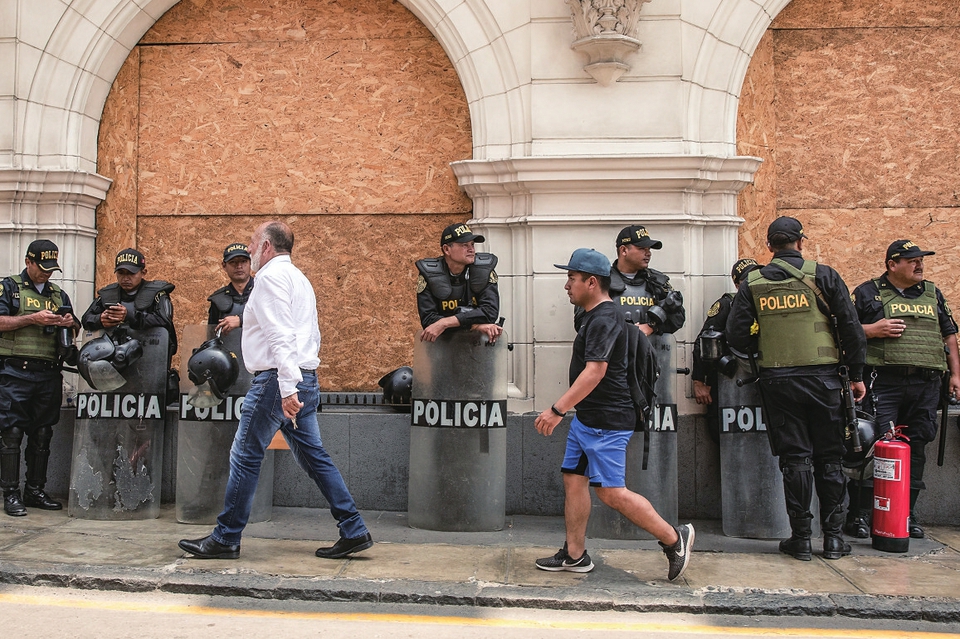 12月14日,警察在秘鲁首都利马市中心执勤。新华社发(玛利亚娜·巴索摄)