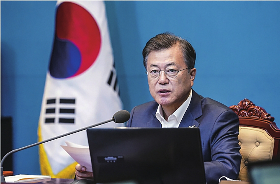 2020年4月27日,时任韩国总统文在寅在首尔青瓦台主持会议。新华社发(青瓦台供图)