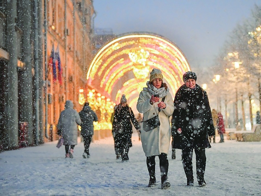 12月10日,在俄罗斯莫斯科,人们在雪中行走。新华社发(亚历山大摄)