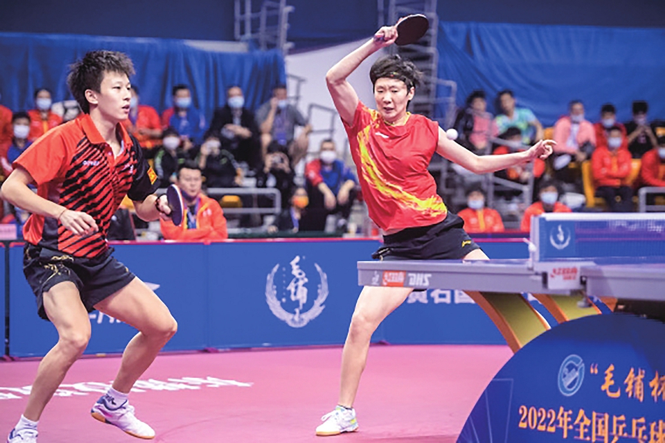11月9日,林高远王曼昱(右)在2022全国乒乓球锦标赛混合双打决赛中。新华社记者伍志尊摄