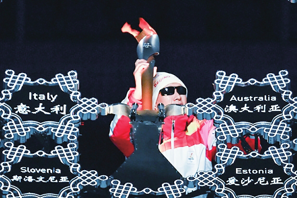 3月4日晚,北京2022年冬残奥会开幕式在北京国家体育场举行。这是最后一棒火炬手李端将火炬嵌入“大雪花”中央。新华社记者李尕 摄