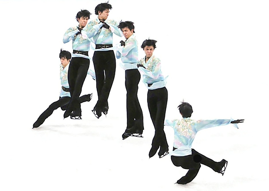 2月10日,日本选手羽生结弦在比赛中尝试阿克塞尔四周跳(拼接照片)。 新华社记者曹灿摄