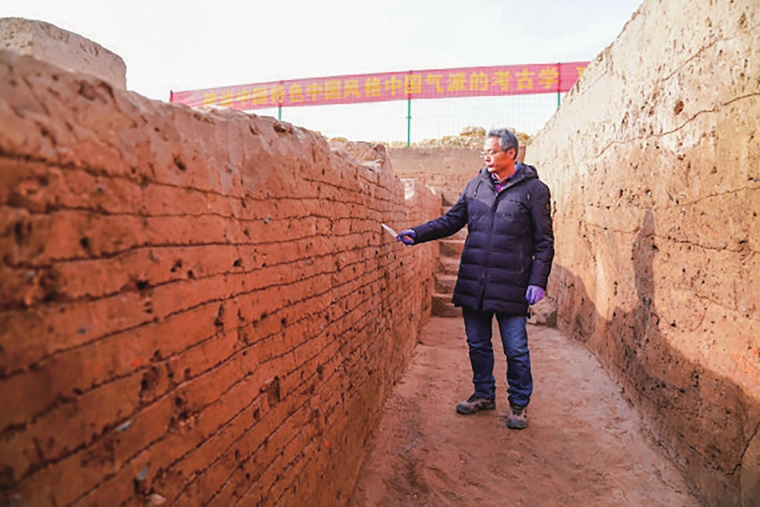 12月16日,考古人员正在研究河北柏人城遗址内的夯土层。 (陈雷摄)