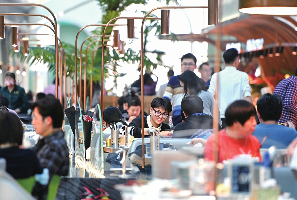 元旦假期第一天,顾客在天津恒隆广场一家自助餐厅内用餐。新华社记者赵子硕摄