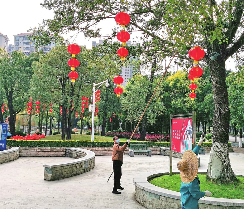 近日,在市区南香公园,工作人员正忙于在树上悬挂灯笼挂饰,扮靓公园景点迎接新春。