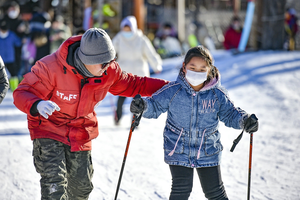 1月2日,在天津市蓟州区一主题乐园,小朋友在教练的陪同下体验初级滑雪。新华社发(王金一摄)