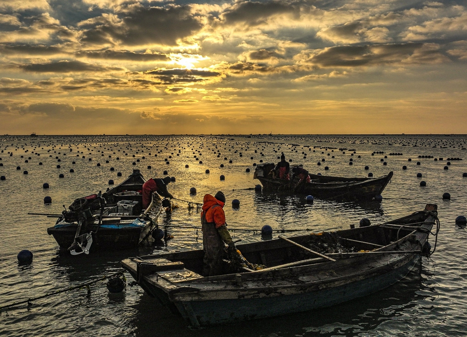 当日,在山东省荣成市寻山街道爱伦湾海洋牧场,渔民驾驶渔船在海上忙碌着,呈现一幅“海上冬耕”的画面。