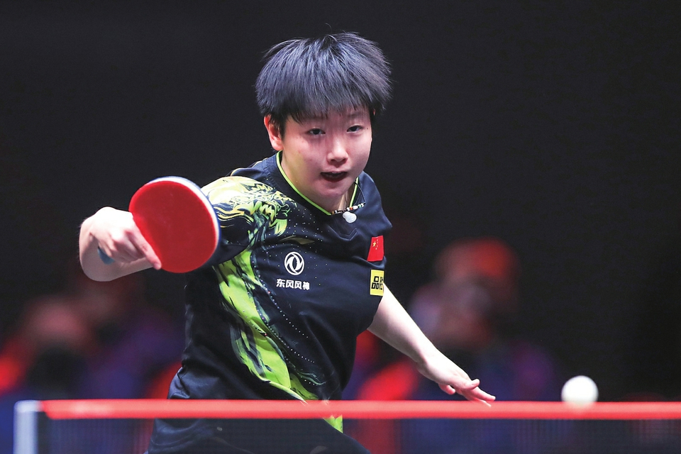 2022年10月30日,在WTT世界杯决赛女子单打决赛中,孙颖莎以4:3战胜陈梦,夺得冠军。图为孙颖莎在比赛中回球。新华社发 高志勇摄