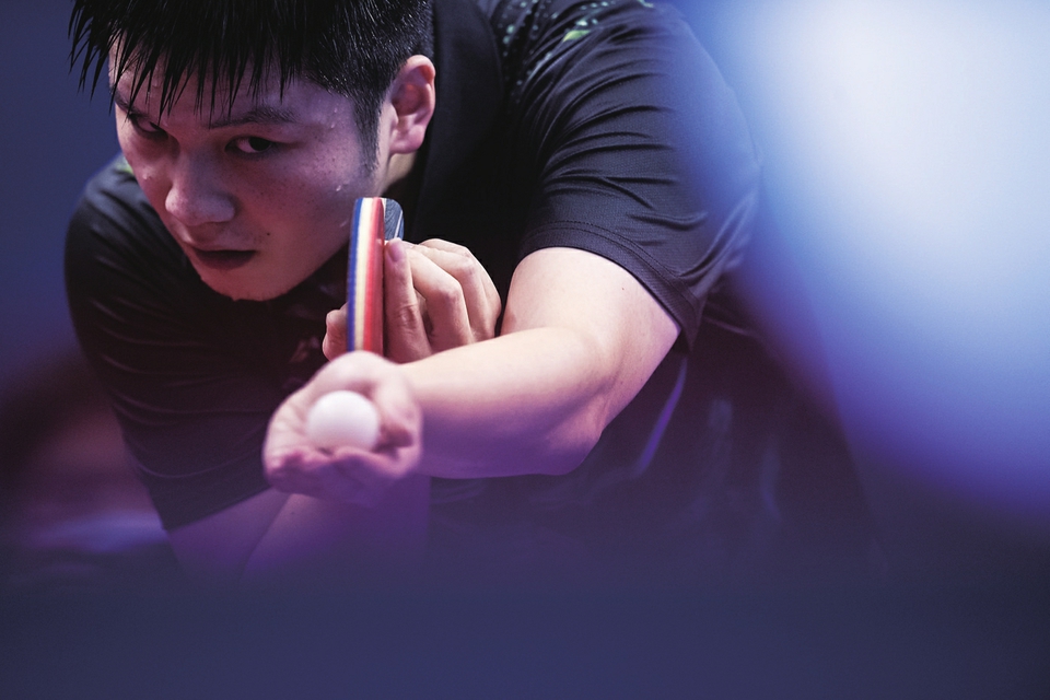 2022年11月12日,在2022全国乒乓球锦标赛男子单打决赛中,上海地产集团队选手樊振东以4:2战胜广东队选手林高远,夺得冠军。图为樊振东在比赛中发球。 新华社记者伍志尊摄