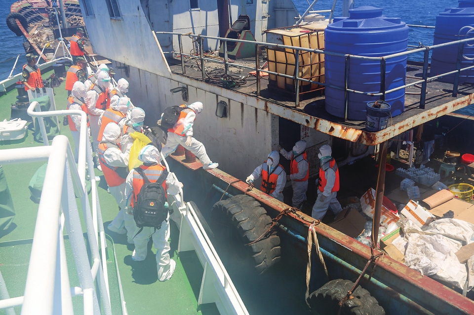 福建福州海警局执法员对嫌疑船只进行强行跳帮(2022年8月12日摄)。 新华社发(吴宗伟摄)