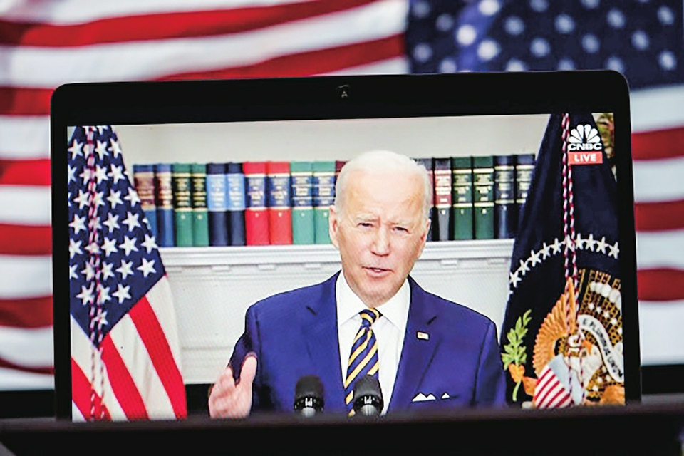 2022年3月8日拍摄的视频画面显示,美国总统拜登在华盛顿白宫发表讲话。拜登当天宣布,美国将对俄实施能源禁运,停止从俄进口石油、天然气和煤炭。 新华社记者刘杰摄