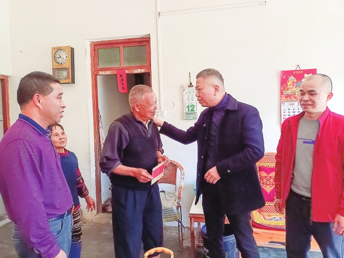 茂名晚报讯 通讯员林俏蔼 在元旦春节期间,为深入贯彻习近平新时代中国特色社会主义思想,全面落实党的二十大精神,加强乡村振兴帮扶工作,持续巩固拓展脱贫攻坚成果,增强群众的幸福感和获得感,帮助老党员和困难群众过一个欢乐祥和的新春佳节,1月13日上午,信宜市城管执法局副局长钟国孟、机关党委专职副书记吕荣雄、驻村第一书记陆兴权一行会同信宜市新宝镇茂门村村委会干部到乡村振兴联系点——新宝镇开展“送温暖、献爱心”春节走访慰问活动,为老党员、困难群众送去慰问品和慰问金,同时也送上新春的祝福和问候。