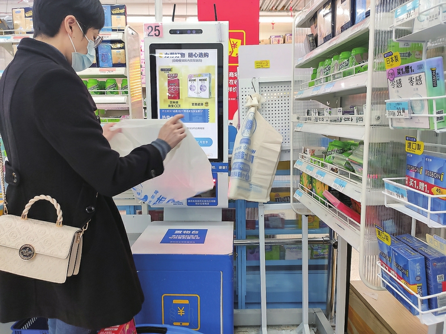 沃尔玛超市提供可降解塑料购物袋。茂名晚报记者池榕摄