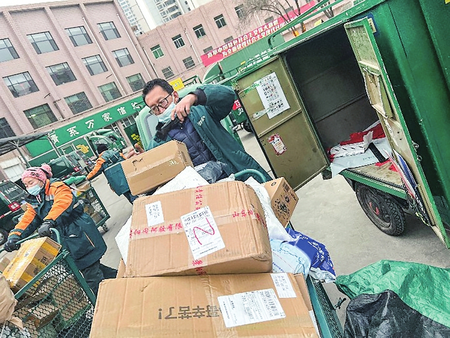 大年初一上午,耿家庄营业部的一名快递员正在整理到站的大件快递。