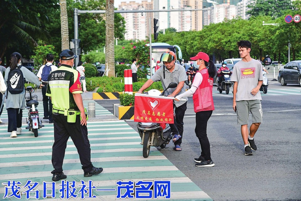 警察和志愿者劝导电动车按照交通规则安全行驶。茂名日报社全媒体记者丘立贺摄