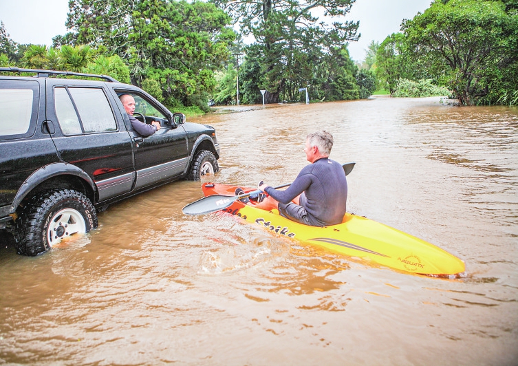 2月14日,在新西兰奥克兰,一名男子在积水路段划船出行。新华社发(赵纲摄)