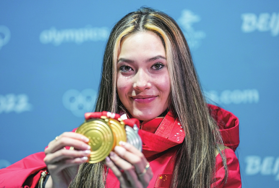 谷爱凌在北京冬奥会上展示获得的奖牌。新华社记者薛玉斌摄
