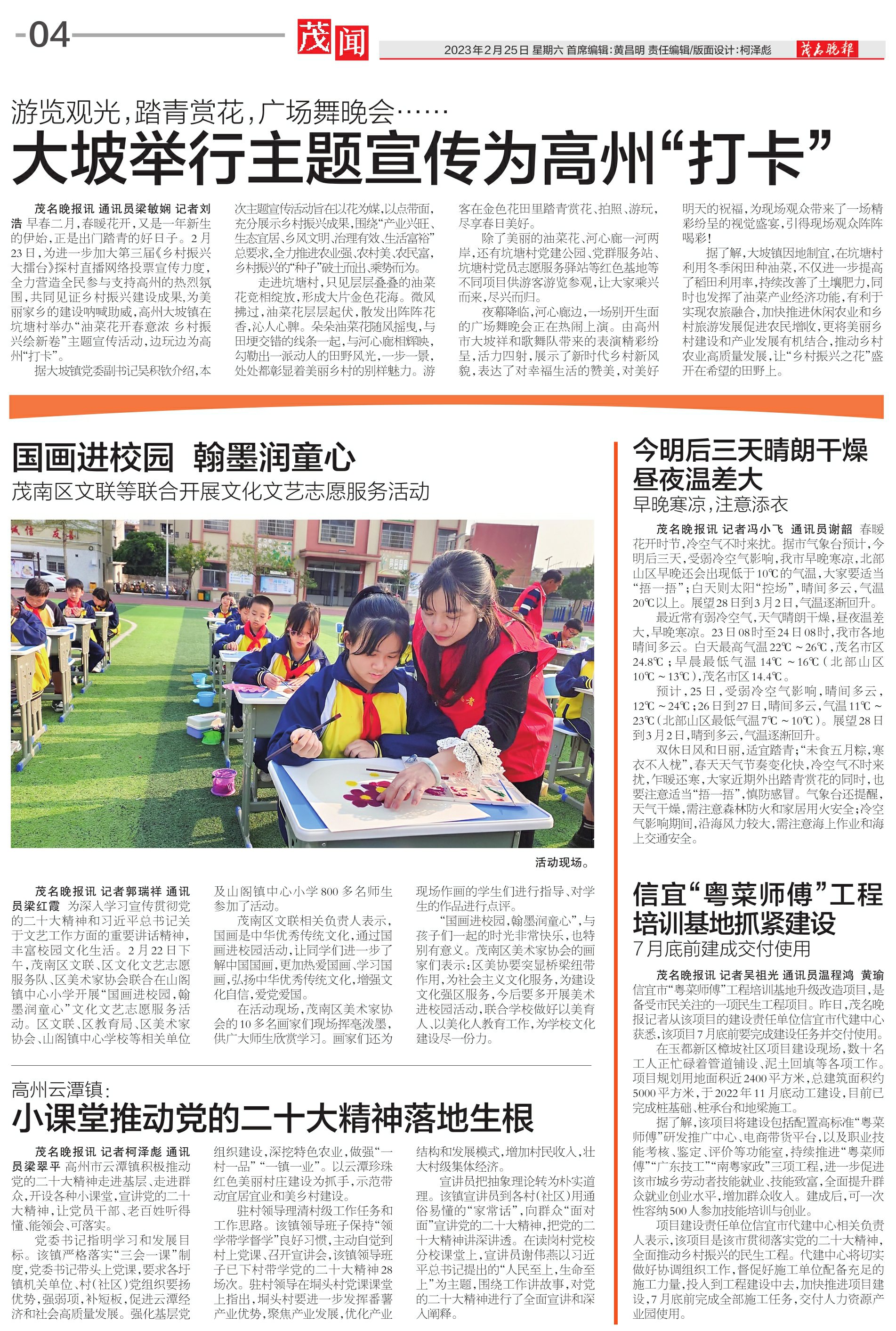 茂名晚报讯记者郭瑞祥通讯员梁红霞 为深入学习宣传贯彻党的二十大精神和习近平总书记关于文艺工作方面的重要讲话精神,丰富校园文化生活。2月22日下午,茂南区文联、区文化文艺志愿服务队、区美术家协会联合在山阁镇中心小学开展“国画进校园,翰墨润童心”文化文艺志愿服务活动。区文联、区教育局、区美术家协会、山阁镇中心学校等相关单位及山阁镇中心小学800多名师生参加了活动。