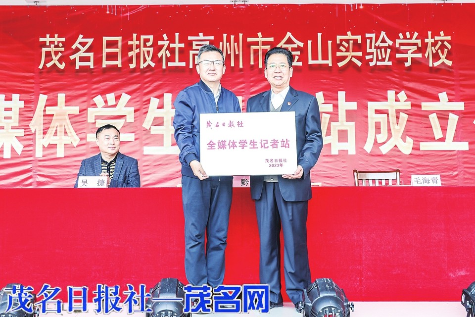 仪式上,茂名日报社纪委书记、茂名日报副总编辑李黔宣读了《关于成立茂名日报社高州市金山实验学校全媒体学生记者站的决定》,并为该校颁授“茂名日报社全媒体学生记者站”牌匾,茂名日报社社长助理、经济新闻中心总监、传媒中心总经理吴捷为学生记者站站长、副站长和指导老师颁发聘书。