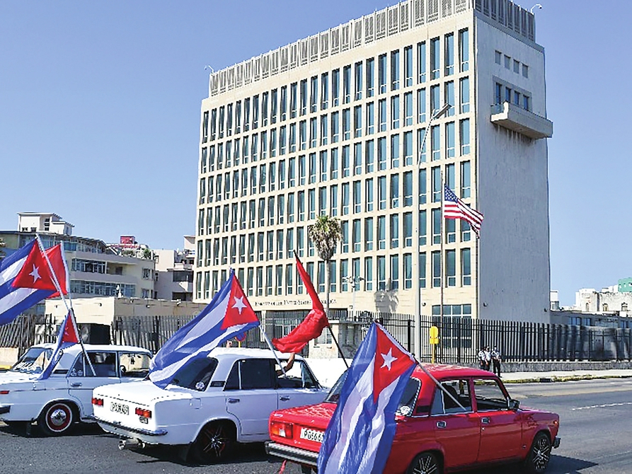 2021年3月28日,由几百名古巴民众组成的车队在首都哈瓦那游行,要求美国结束对古巴近60年封锁。图为参加游行的车队经过位于哈瓦那的美国驻古巴大使馆。新华社记者朱婉君摄