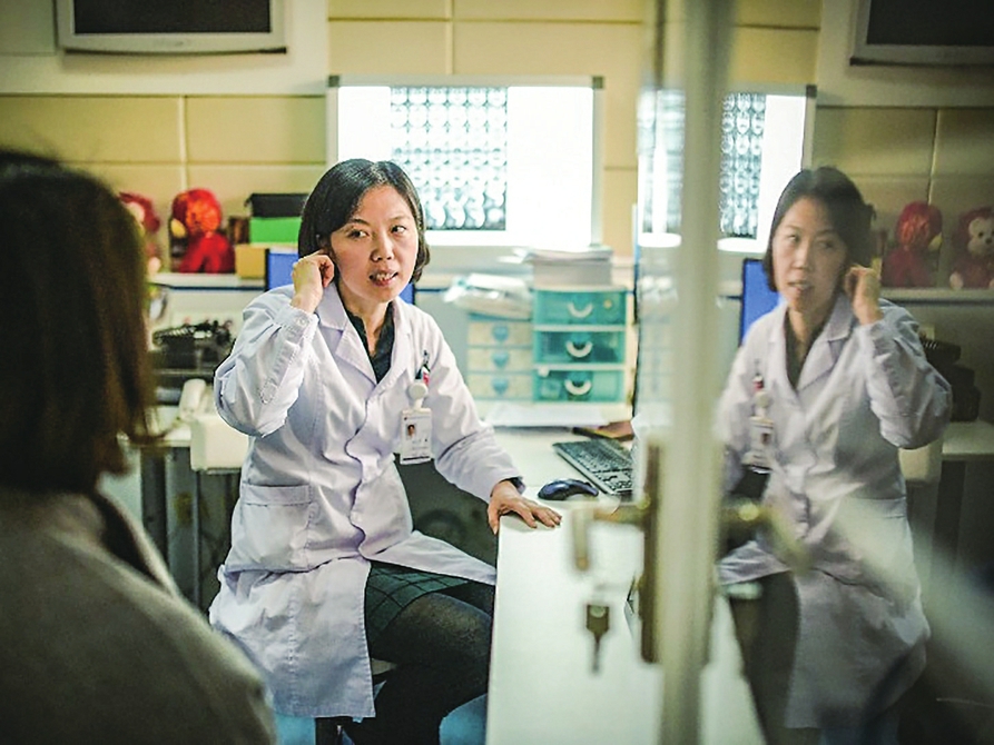 天津市第一中心医院耳鼻咽喉头颈外科主任王巍为患者讲解如何正确使用耳机。(天津市第一中心医院供图)