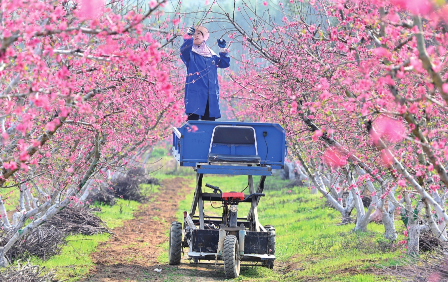 村民在广西柳州市柳江区穿山镇林寺村鹰嘴桃种植基地进行桃园管护作业。天气转暖,各地农民抢抓农时开展春耕备耕等农业生产。新华社发(黎寒池摄)