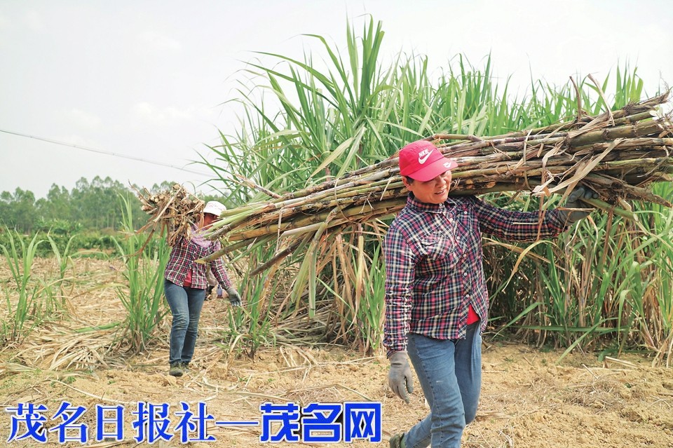 彭秀红和社员搬运甘蔗。茂名晚报记者池榕摄