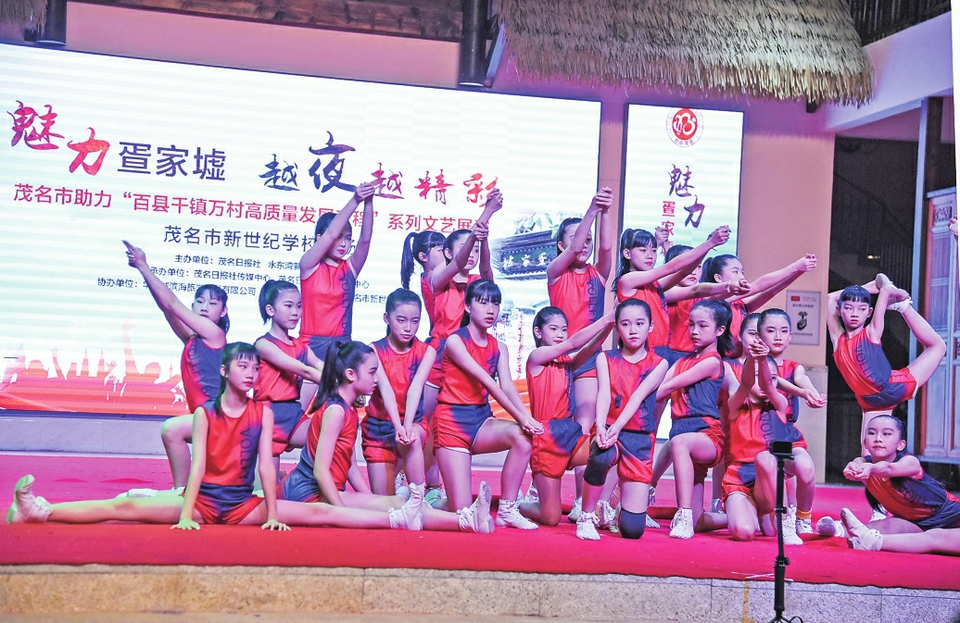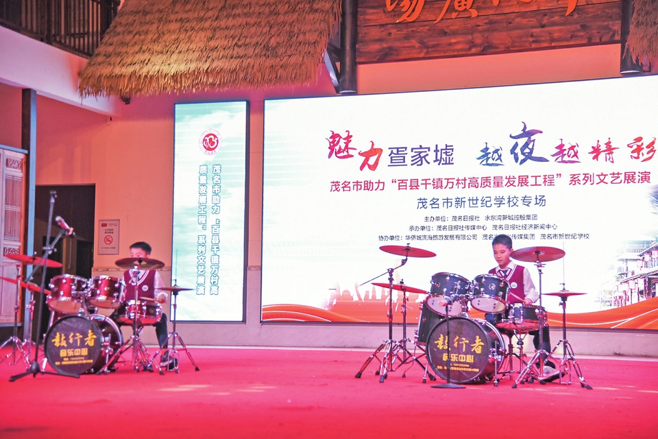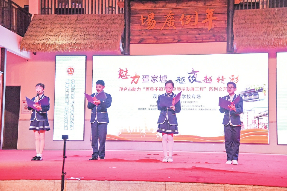 茂名晚报讯 昨晚,以“魅力疍家墟越夜越精彩”为主题的茂名市助力“百县千镇万村高质量发展工程”系列文艺展演茂名市新世纪学校专场在晏镜·疍家墟年例广场精彩上演。本次文艺展演共有17个节目,通过歌舞表演、乐器演奏、粤剧、朗诵等多种节目形式,为观众带来了一场视觉盛宴。