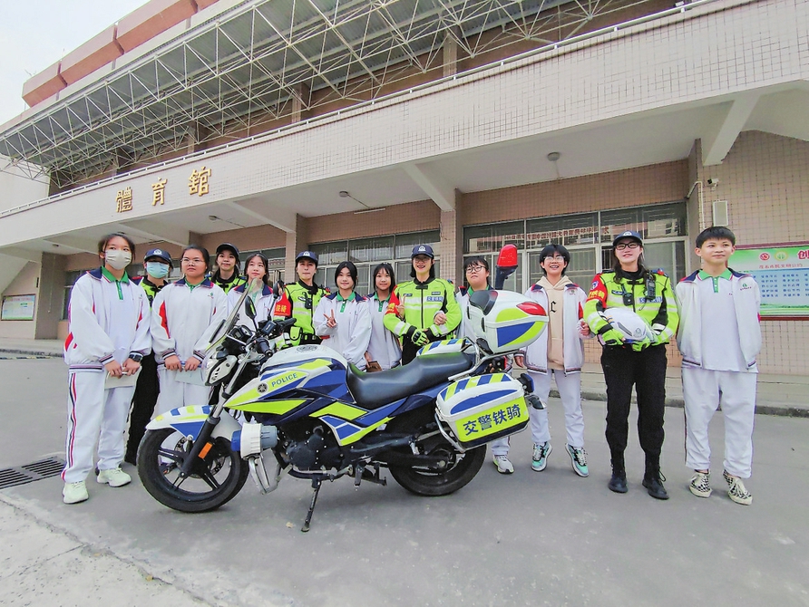 铁骑队员与同学们合影留念。通讯员何亚勇 孙霞摄