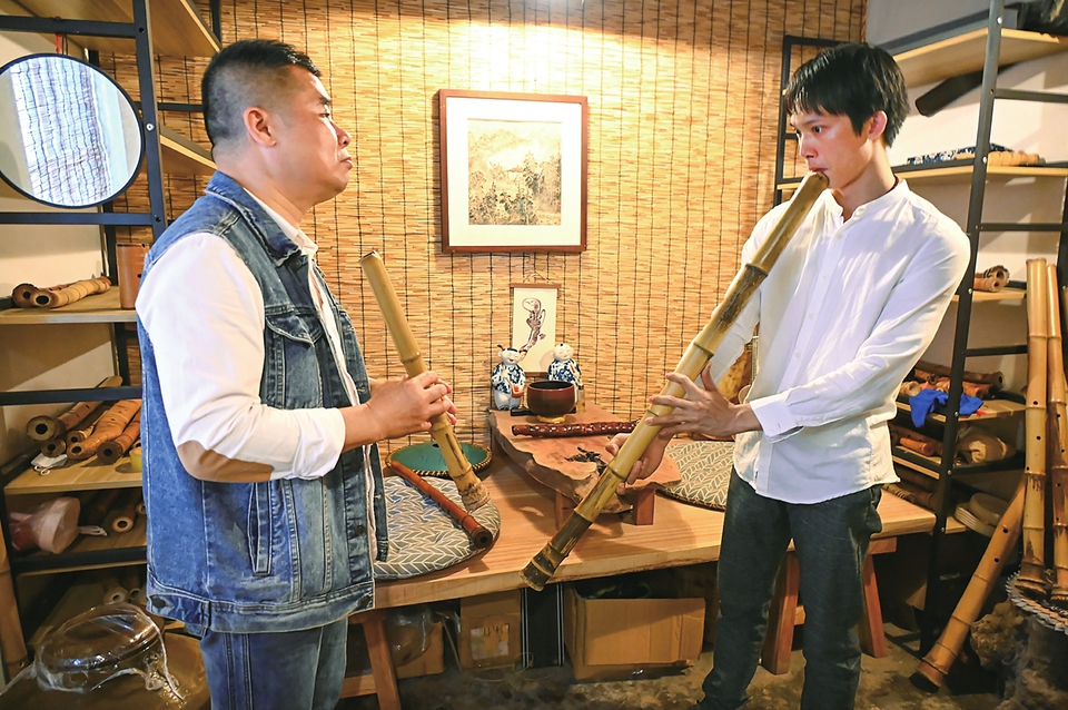 钟春木给客人演示尺八的演奏方法。茂名日报社全媒体记者黄信涛摄