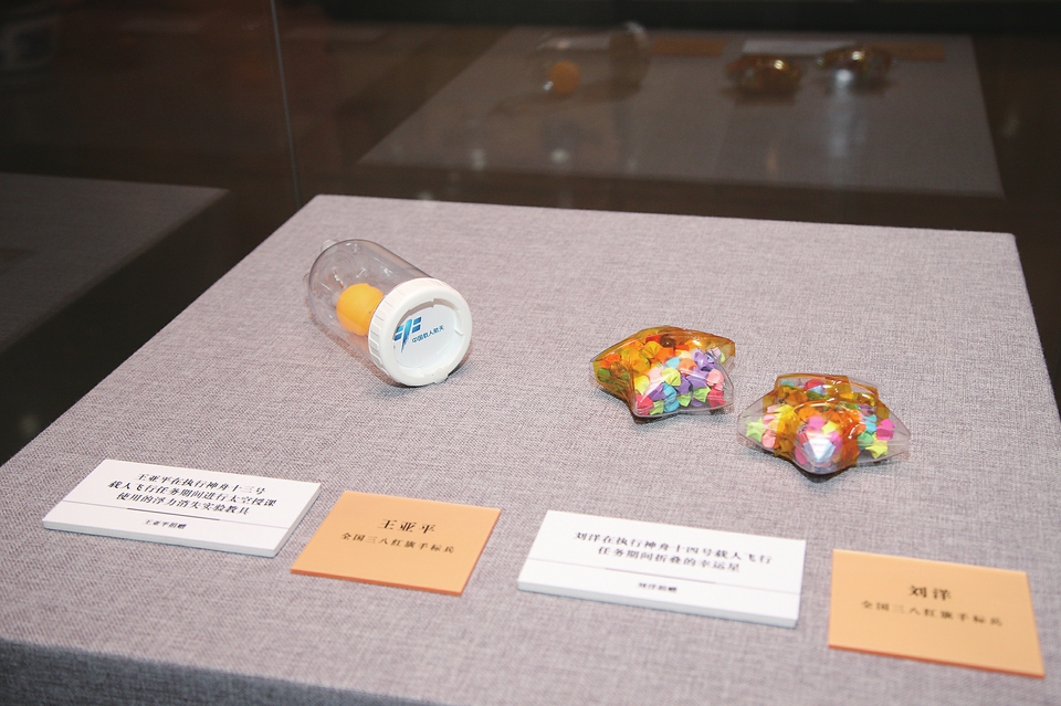 王亚平太空授课的实验教具和刘洋手折的幸运星。(图片由中国妇女儿童博物馆提供)