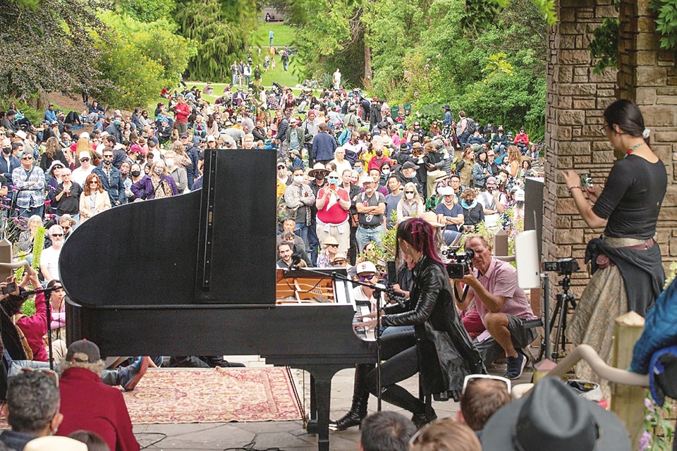 2021年9月19日,人们在美国加利福尼亚州旧金山植物园的“花和钢琴”活动中欣赏音乐。新华社发(李建国摄)
