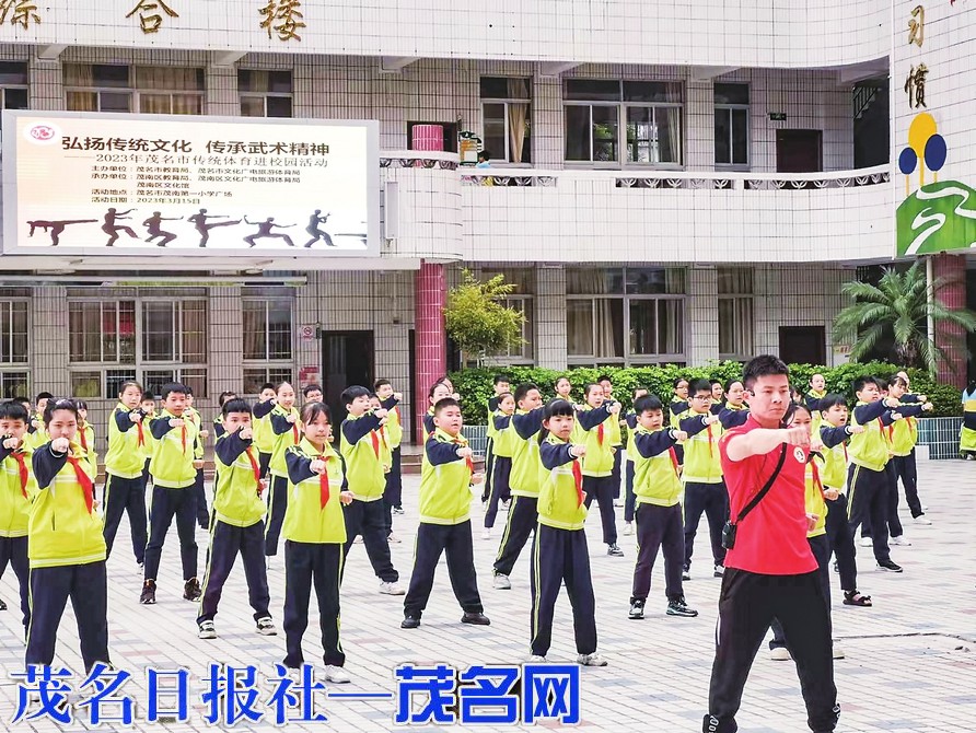 茂南一小的学生们在教练的带领下,练起拳来有模有样。茂名晚报记者张丁文摄