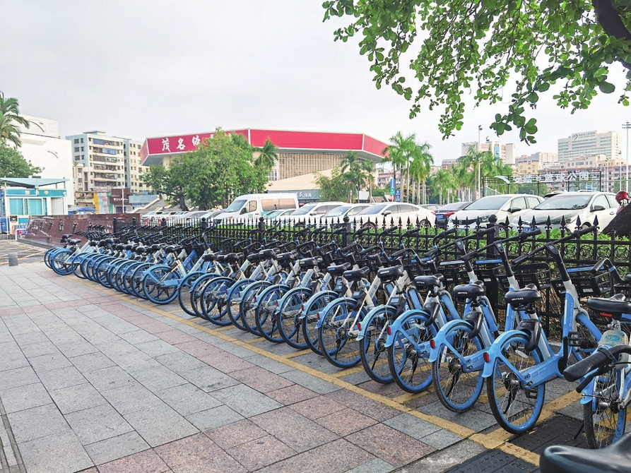 摆放整齐的共享单车。 茂名晚报记者柯诗华摄