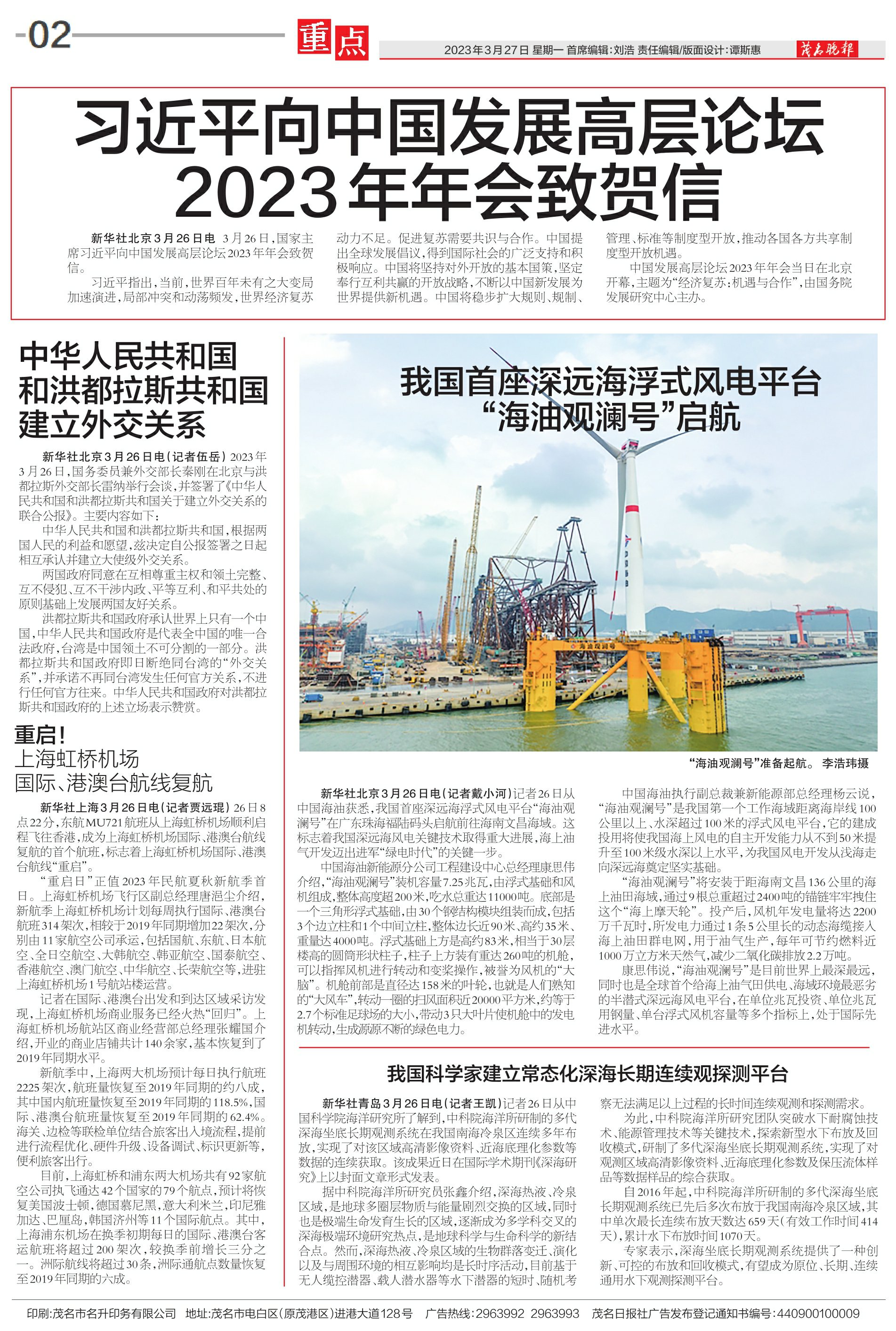 我国首座深远海浮式风电平台“海油观澜号”启航