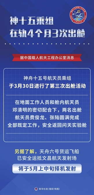 新华社北京4月1日电(李国利、邓孟)据中国载人航天工程办公室消息,神舟十五号航天员乘组于3月30日进行了第三次出舱活动。在地面工作人员和舱内航天员邓清明的密切配合下,两名出舱航天员费俊龙、张陆圆满完成全部既定工作,安全返回问天实验舱。