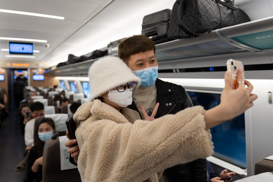4月1日,旅客在G99次列车发车前自拍留影。当日,上海虹桥至香港西九龙G99次列车发出,标志着沪港高铁正式恢复开行。新华社记者王翔摄