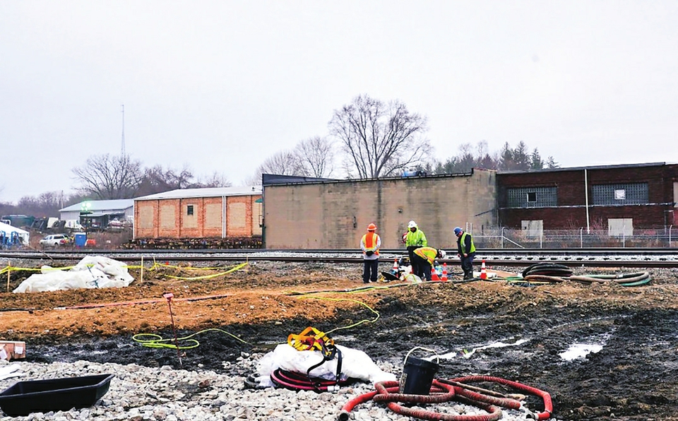 2月14日,在美国俄亥俄州东巴勒斯坦镇,工作人员在事故现场附近处理污水。新华社发(章焱飞摄)