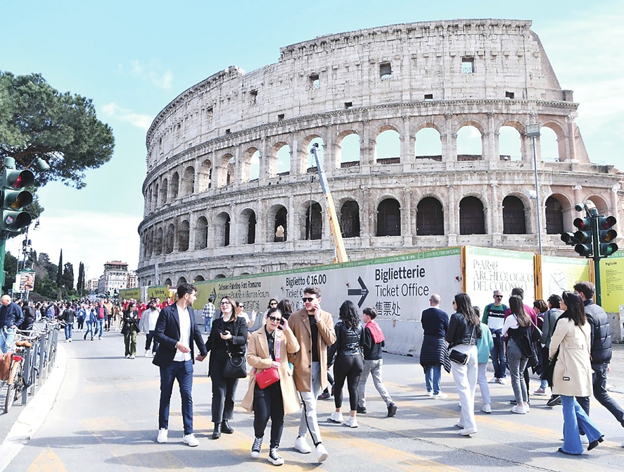 3月26日,游客走过意大利罗马斗兽场的指示牌(。(新华社记者金马梦妮摄新华社记者金马梦妮摄))