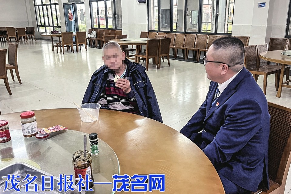 在包茂高速(粤境段)曹江生活区饭堂,值班站长朱绍仃(右)为老人打来热饭菜,并耐心与其沟通。