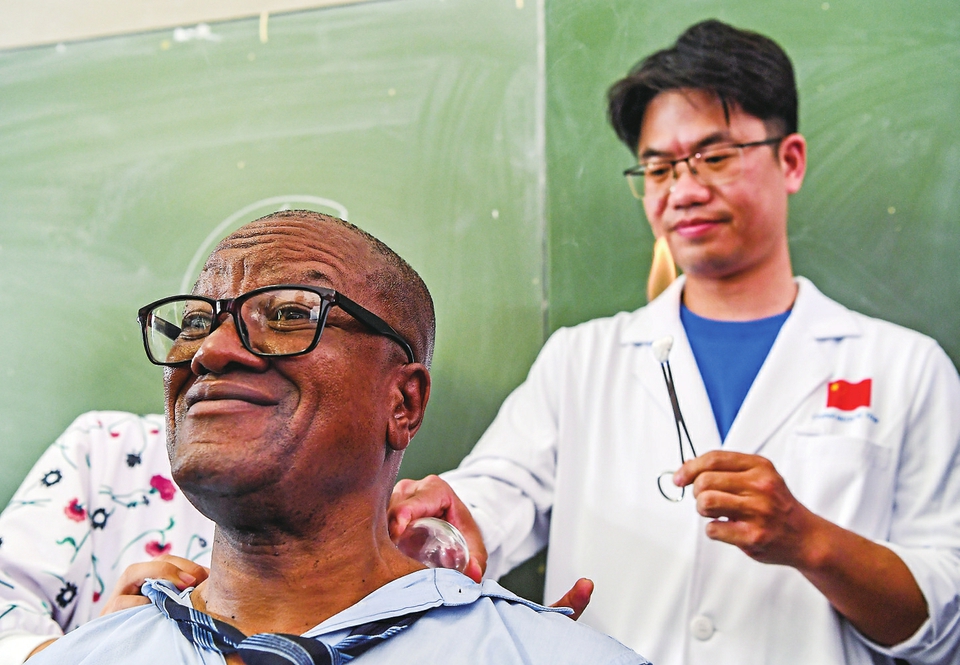 4月3日,在纳米比亚温得和克的伊曼纽尔·谢菲迪中学课堂上,校长卡奇翁瓜体验拔火罐。新华社发(穆萨·卡萨克摄)