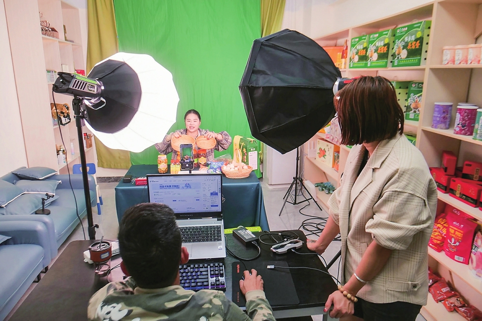 罗梅与团队直播带货。 茂名晚报通讯员陆波 摄