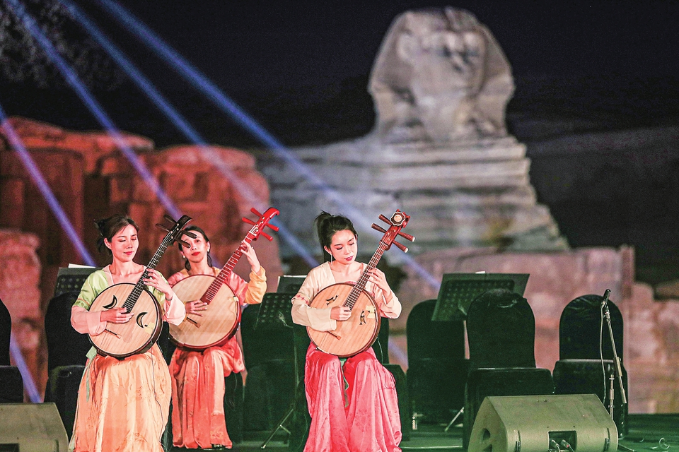 3日晚日晚,,由中国文化和旅游部由、埃及旅游和文物部、中国驻埃及大使馆共同主办的中国--埃及民族音乐会在吉萨金字塔景区举办。中国中央民族乐团艺术家和埃及民族音乐家联袂为现场观众献上精彩演出。