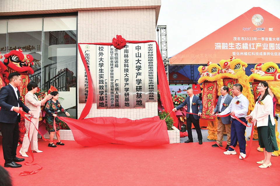 广东深融生态产业有限公司聚焦制造业当家高质量发展目标,致力打造现代化数字农业和科创龙头企业,立足化州橘红平定核心产区优势,目前已建立起完善的化橘红标准种植和建立产品溯源体系。公司携手科研机构、高等院校推进化州橘红产学研融合发展,已获得3个发明专利、5个实用新型专利,首批专利成果已成功转化投产。活动上,该公司分别和蒙牛成员企业、杭州奇鹅网络科技有限公司、中国移动通信集团广东有限公司茂名分公司、中山大学生命科学学院、中南林业科技大学、岭南现代农业科学与技术广东省实验室茂名分中心、广东轻工职业技术学院签约,在化橘红综合研究、产品深度开发、成立博士工作站、建立大学生校外实践教学基地等方面开展深入合作。