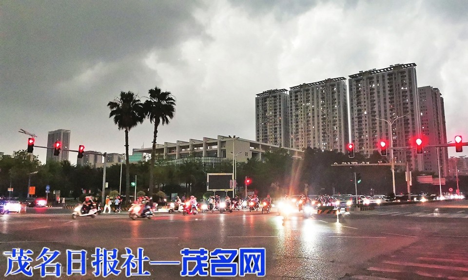 昨天早晨,受强对流云系影响,茂名市气象台发布茂南区、高新区和滨海新区雷雨大风黄色预警信号。在中心城区,天空乌云密布,大雨倾盆,路面能见度较低,开车的市民纷纷打开车灯,减速慢行。茂名日报社全媒体记者岑稳摄